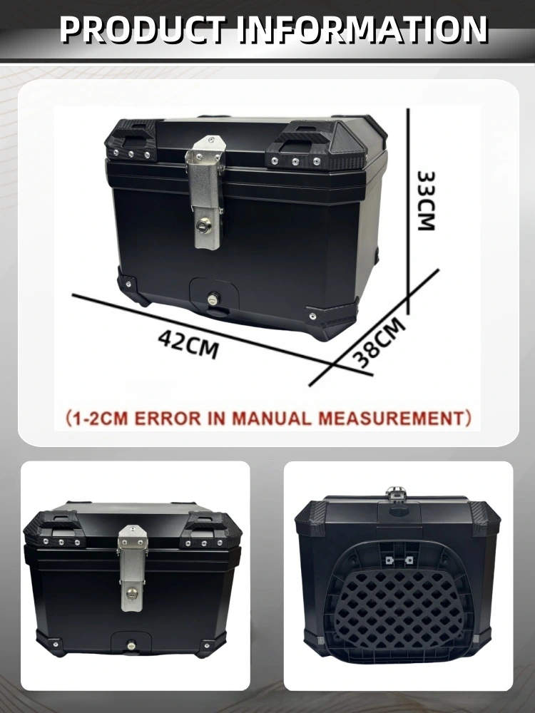 45L ABS motorcycle top box measures 36×37×28cm which makes it has plenty of space for a full-face helmet, plus gloves, rain gear, and your daily bag. The bracket fits most motorcycles and electric bikes, and works with a cargo rack. There are multiple mounting holes for different vehicles. Every order includes installation accessories and a steel base plate—so you can mount it securely and stop it from shaking loose. Those are free within orders.