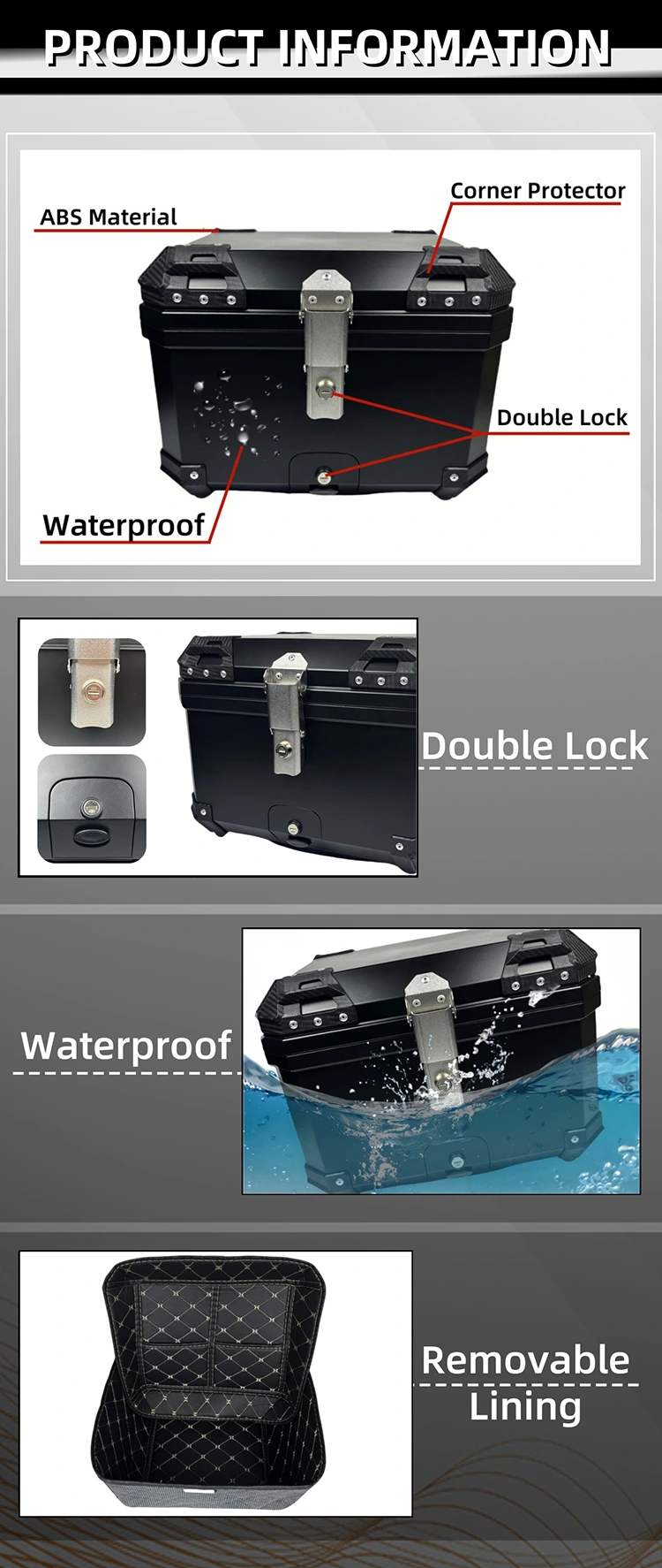 top case ABS motorcycle top box backrest uses a linked dual-lock system—you must unlock both locks to open it. That drastically cuts down theft risks. Lock it up when you park, and leave your helmet, ID, and gear safe and sound.