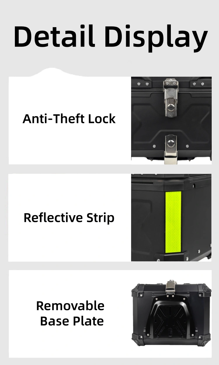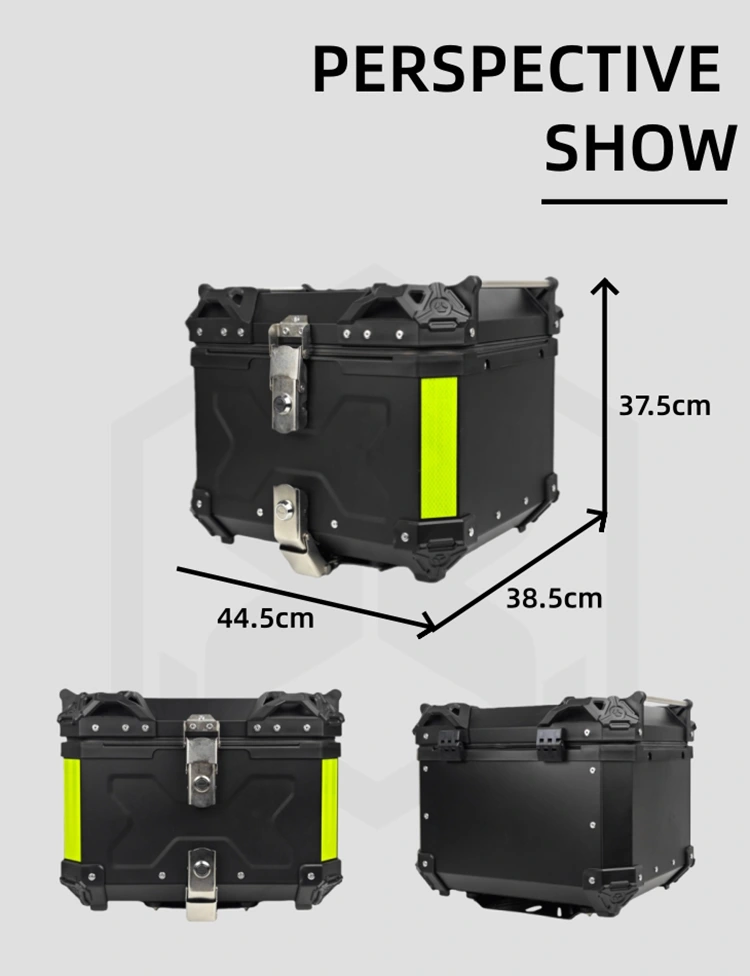The outer shell Aluminium material of Aluminium Motorcycle trunk For Storage ,The product has an exquisite appearance.It has excellent sealing properties and is not afraid of rain.The double-lock design enhances its anti-theft performance.Makes users feel at ease .No need to worry about the items inside the box getting wet or being stolen.