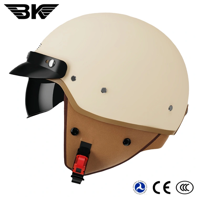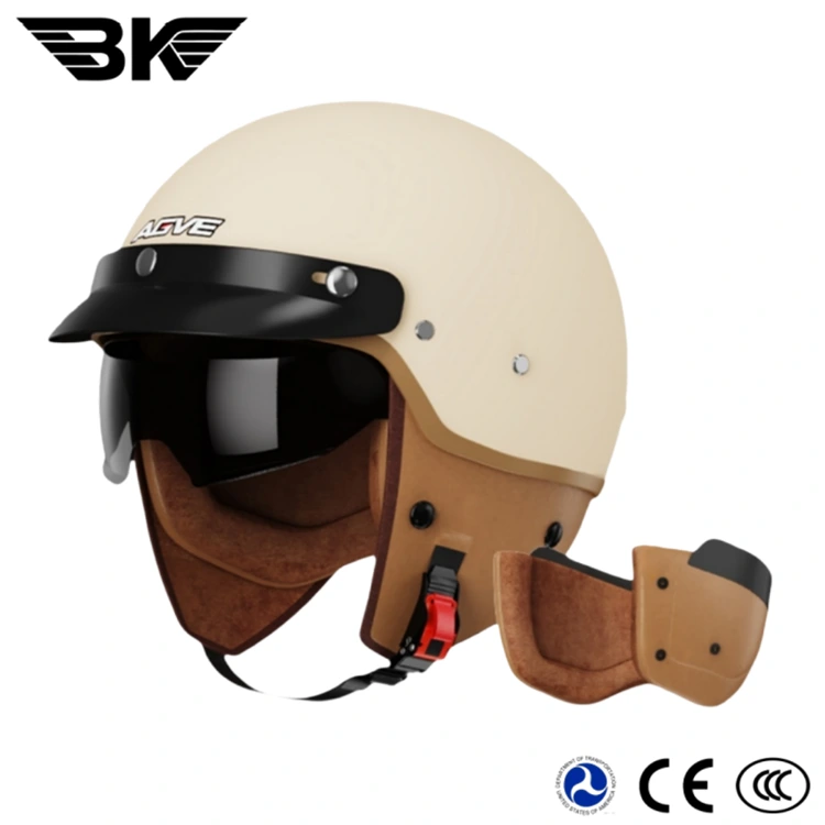 Dot vintage motorbike helmet is suitable for four seasons .Removable ear pads for easy washing.Stay cool and fresh in the summer! In the cold winter ,the ear pads block the wind,keeping you warm throughout the season.Black visor is made of high PC ,Stay clear and safe in bright light.ABS shell with a smooth ,rounded design.without other decals.We can easy to print your logo on the helmet.The high-density foam liner provides excellent shock absorption.It was passed the DOT strictly testing .While the suede lining offer a skin-friendly,comfortable feel.Equipped with a black short visor and a removable brim.That looks nice .It combines classic retro style with practical functionality.One the back of helmet,we have designed a specially goggle retention clip.Allowing you to freely pair the goggles with the helmet.