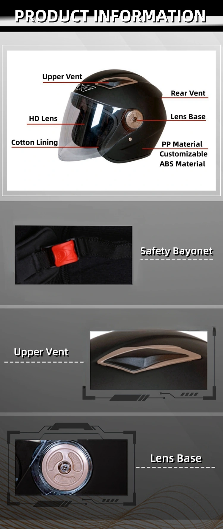 Ningde Chief Pigeon Technoligy Co.Ltd is a Motorcycle Half Face Helmets manufacturer and supplier of motorcycle helmets located in China.As a leader in the helmet industry with over than 16 years of dedicated experience, our factory is ISO certified, and our production and management are highly qualified and safe.We provide helmets with good price and high quality. Looking forward to being with your partner. The Half Face Helmets have a HD single lens ,cotton lining ,safety buckle and ventilation design.