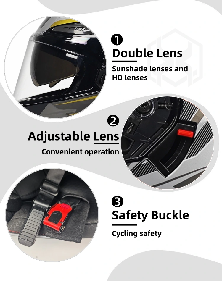 The black base with silver-white geometric lines creates distinct visual effects depending on the color scheme. The minimalist geometric design paired with the “911 HELMET” logo delivers a full-on track-inspired tech aesthetic. Double lens design: inner lenses provide sun protection while outer lenses shield against wind (interchangeable with various colored lenses), ensuring customers' basic usage needs are met. Our Double lenses Motorcycle Modular Helmets has built-in slots on both ear pads for Bluetooth headsets—works with most headsets, no damage to the helmet. The back has a unique oversized spoiler, looks cool and cuts down wind resistance a lot. Dual ventilation ports on the top and chin allow for open-air cooling in summer and closing for keep temperature in winter, eliminating the need to change helmets for all-season riding.