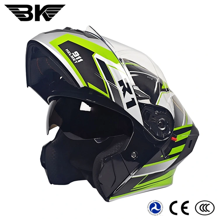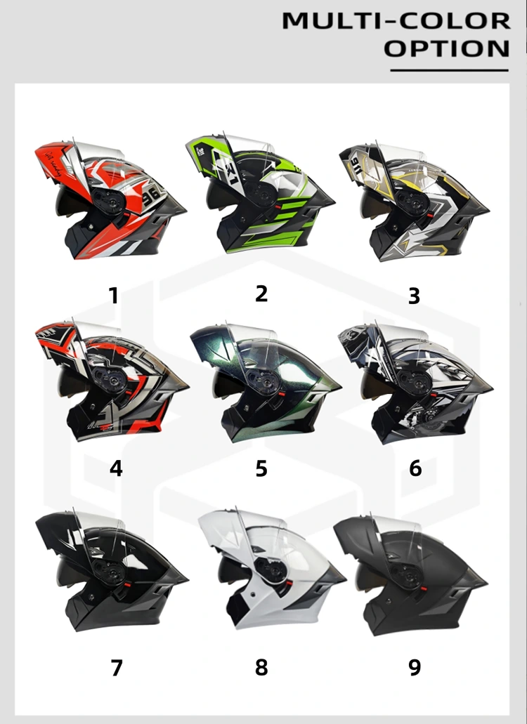 This Unisex Motorcycle Modular Helmets weigh 1580 kg and features a 180° flip-up face shield (full-face/open-face combo). Constructed primarily from ABS material, it offers size options from S to XL. Also, there are multiple colors (we can customize them for you). You can upgrade the rear spoiler to a lighted one for safer night rides. And as you can see, we have interchangeable visors—tinted, silver-coated, gold-coated—so you can make the helmet your own style.