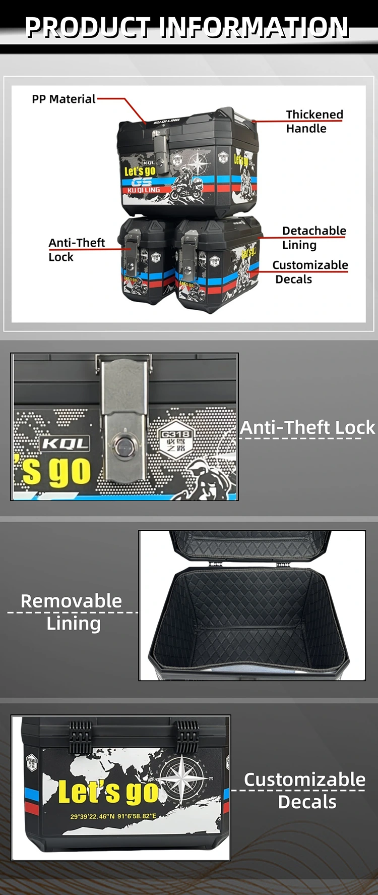 As a leader in motorcycle accessory industry with over than 16 years of dedicated experience, our factory is ISO certified, and our production and management are highly qualified and safe.We provide motorcycle accessories with factory price and high quality. Looking forward to become your long-term partner.This modular motorcycle tail box is made of PP material. There are also multiple options available, including matching the base plate and lining. The 47L and 25L capacity fully accommodates your daily needs.